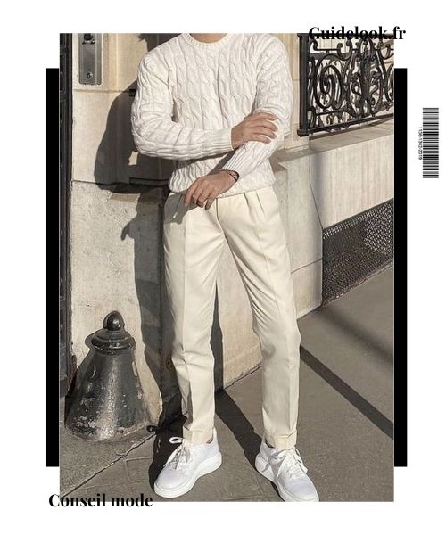 Pour un look plus habillé, optez pour des pantalons blancs confectionnés dans un mélange de coton plus épais voire de laine. On peut également atténuer l’éclat du blanc en choisissant des tons crème ou blanc cassé, ou en utilisant des tissus texturés qui diffusent la luminosité.