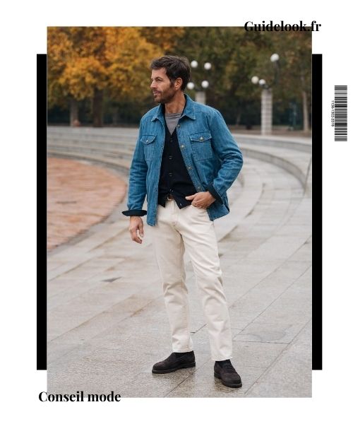 Les nuances de bleu de vêtements en denim indigo ressortent particulièrement bien lorsqu’elles sont accompagnées d’un pantalon blanc. Combinez ce dernier avec des baskets blanches et une veste en jean.